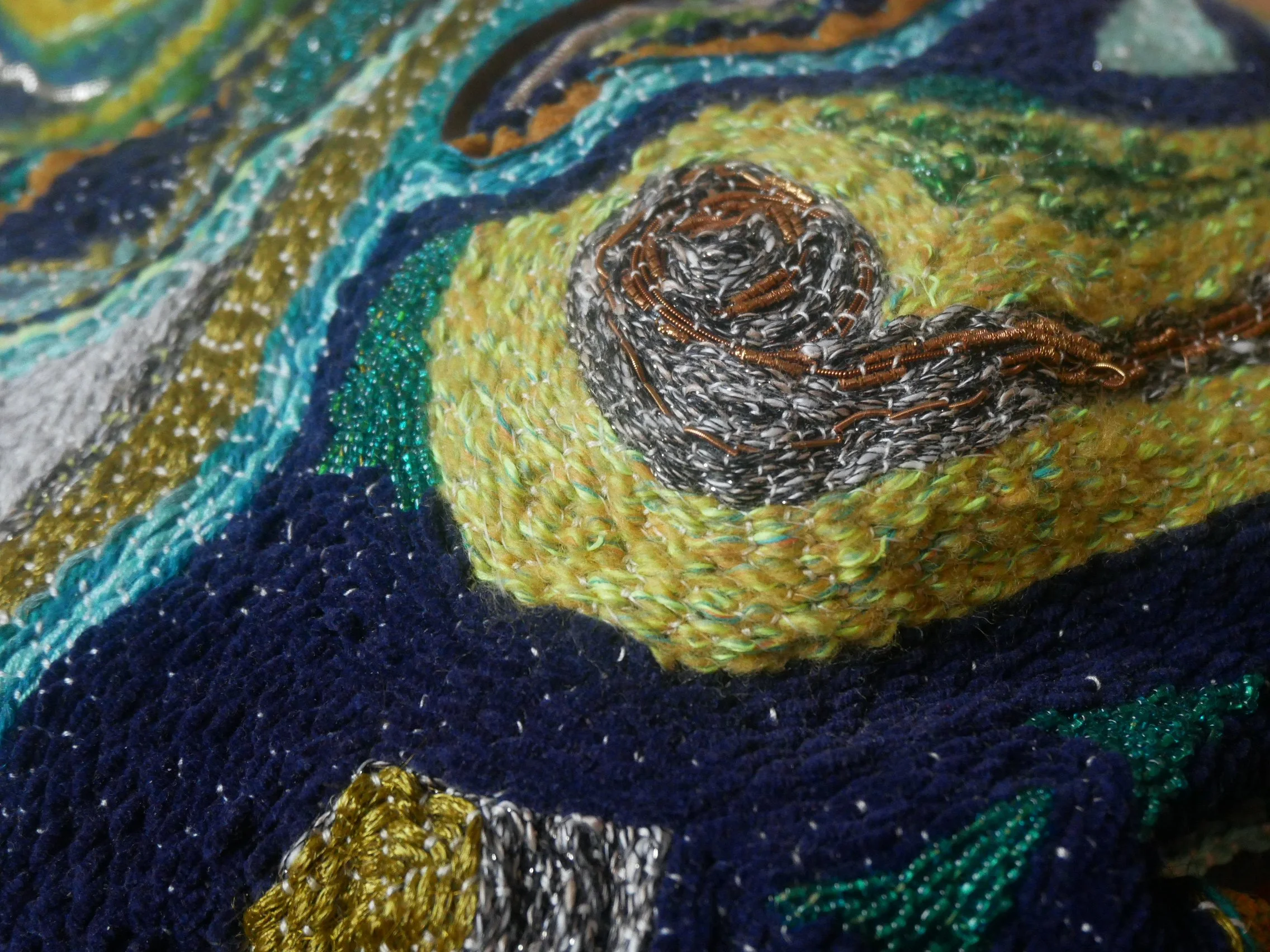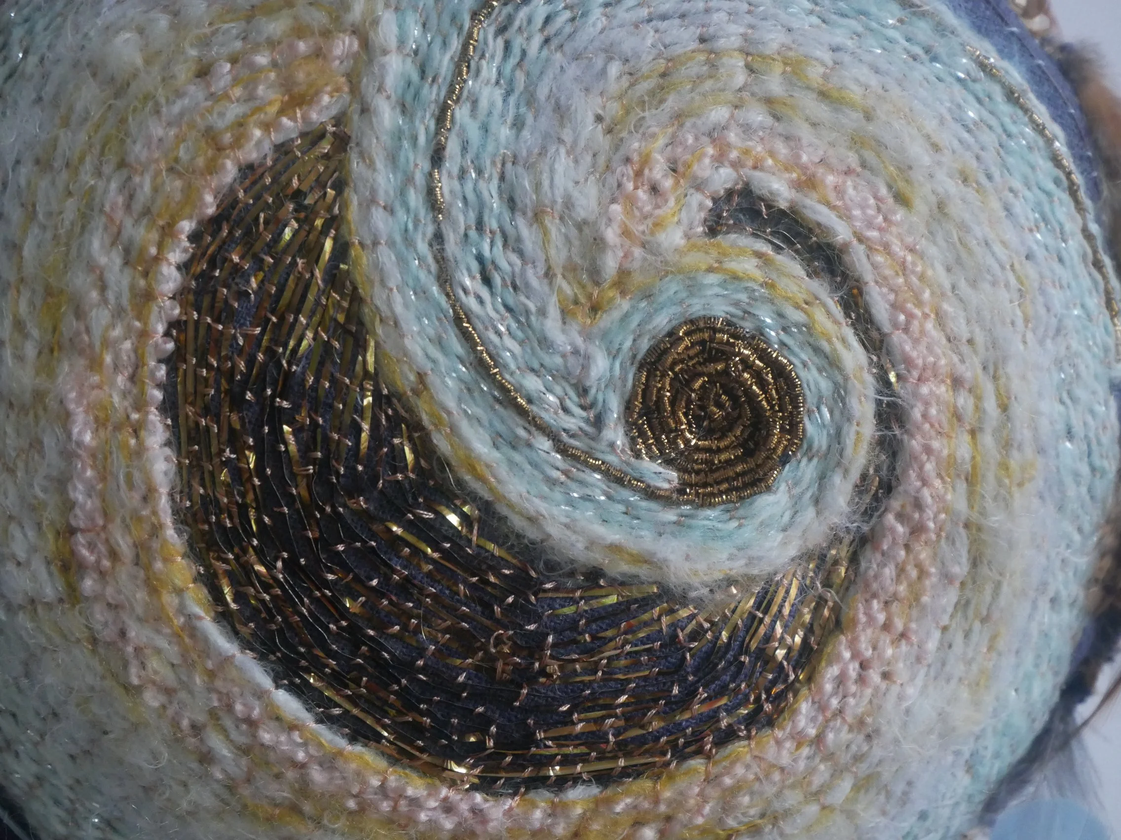 C’est en tombant sur la photo satellite d’une galaxie que cette série est née. J’ai découvert alors des images astronomiques prises au moyen de télescopes : images de galaxies situées à des millions d’année-lumière, des galaxies spirales aux couleurs vives, avec des pointes de brillance, un aspect duveteux et cotonneux. Étoiles, trous noirs, constellations, Voie Lactée sont devenus un nouveau terrain d’exploration.